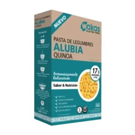 Pasta de legumbres Alubia y Quínoa- Fusilli Ingredientes: Harina de poroto alubia, Harina de arroz y harina de quinoa. * Apto Vegano * Sin Aditivos * 0% Grasas Trans * 0% Colesterol * Bajo en Sodio * No GMO Contenido Neto: 250 grs. Pastas de granos ancestrales Wakas son libres de gluten, sin lactosa y sin conservantes.