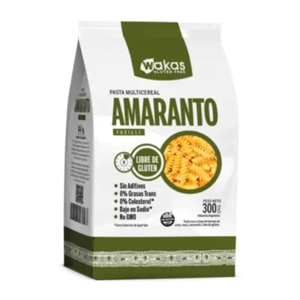 Pasta Multicereal con Amaranto – Fusilli Ingredientes: Harina de Arroz, Harina de Maíz (No GMO), Harina de Amaranto. * Apto Vegano * Sin Aditivos * 0% Grasas Trans * 0% Colesterol * Bajo en Sodio * No GMO Contenido Neto: 300 grs. Pastas de granos ancestrales Wakas son libres de gluten, sin lactosa y sin conservantes.