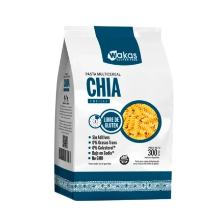 Pasta Multicereal con Chia – Fusilli Ingredientes: Harina de Arroz, Harina de Maíz (No GMO), Harina de Chia. * Apto Vegano * Sin Aditivos * 0% Grasas Trans * 0% Colesterol * Bajo en Sodio * No GMO Contenido Neto: 300 grs. Pastas de granos ancestrales Wakas son libres de gluten, sin lactosa y sin conservantes.