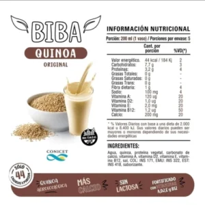 Aporta una cuota importante de proteínas y múltiples beneficios nutricionales derivados del grano de la quinoa, uno de los alimentos vegetales que provee todos los aminoácidos esenciales. Así, una porción de “Biba” aporta vitaminas A, D2, E, B12 y calcio. Además, no contiene sacarosa añadida, ni conservantes, ni lactosa y es libre de gluten.