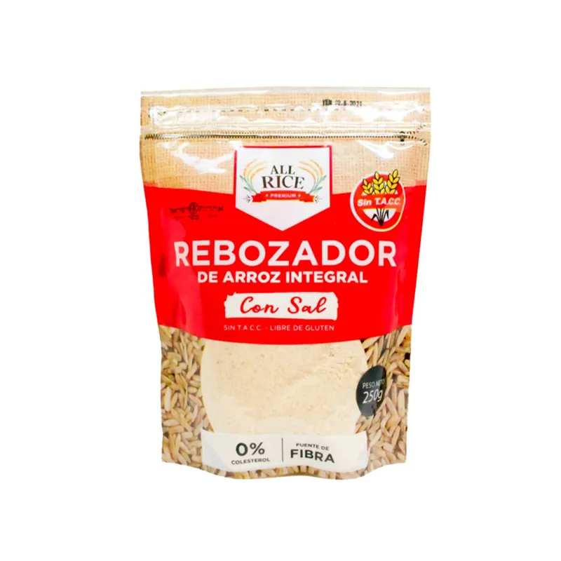 INGREDIENTES Almidón de Maíz, Harina de Arroz, Maltodextrina, Oleo Margarina, Sal, Dextrosa, Leudantes químicos: Bicarbonato de Sodio, Cremor Tártaro. INFORMACIÓN NUTRICIONAL SIN LACTOSA Y SIN HUEVO – TENOR GRASO 0,9% Porción = 30g Valor energético 119 kcal=500 KJ (6% VD*), Proteínas 2,2 g (3% VD*), Grasas Totales 0,9 g (2% VD*), Grasas Saturadas 0,5 g (2% VD*), Grasas Trans 0,2 g (**), Fibra Alimentaria 1,3 g (5% VD*), Sodio 203 mg (8% VD*) (*) %Valores diarios con base a una dieta de 2.000 kcal u 8.400 kJ. Sus valores diarios pueden ser mayores o menores dependiendo de sus necesidades energéticas.ALL RICE REBOZADOR DE ARROZ INTEGRAL SIN SAL