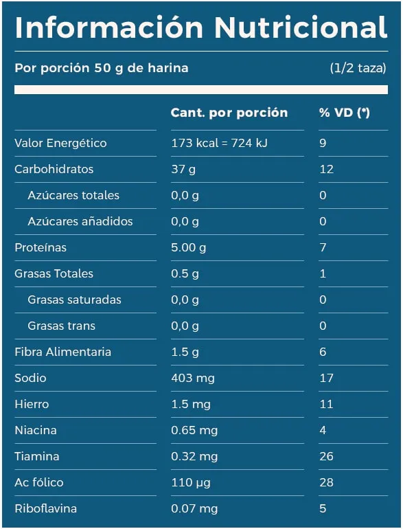 (*) Según Ley N° 25630: Hierro = 30mg/kg, Ácido Fólico = 2,2 mg/kg, Tiamina (B1) = 6,3 mg/kg, Riboflavina (B2) = 1,3 mg/kg, Niacina = 13 mg/kg.
