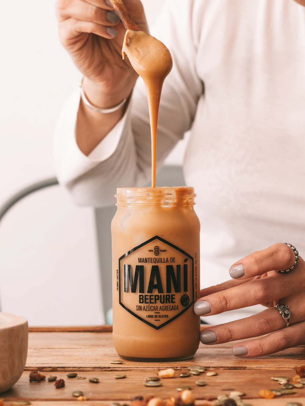Mantequilla de maní 100% maní sin azúcar. Seleccionamos el mejor maní cordobés para preparar la mantequilla de maní BEEPURE. Está buenísima para untar en tostadas, para combinar con granolas, frutas y preparaciones reposteras.