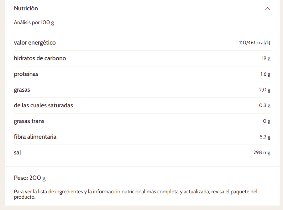 Agua , almidón de maíz , harina de arroz , fibra vegetal (psyllium) , espesante: hidroxipropilmetilcelulosa ; aceite de girasol , proteína de soja , levadura , sal , fibra cítrica , azúcar . acidulante: ácido cítrico . Alérgenos: Contiene derivados de soja. Sin gluten.