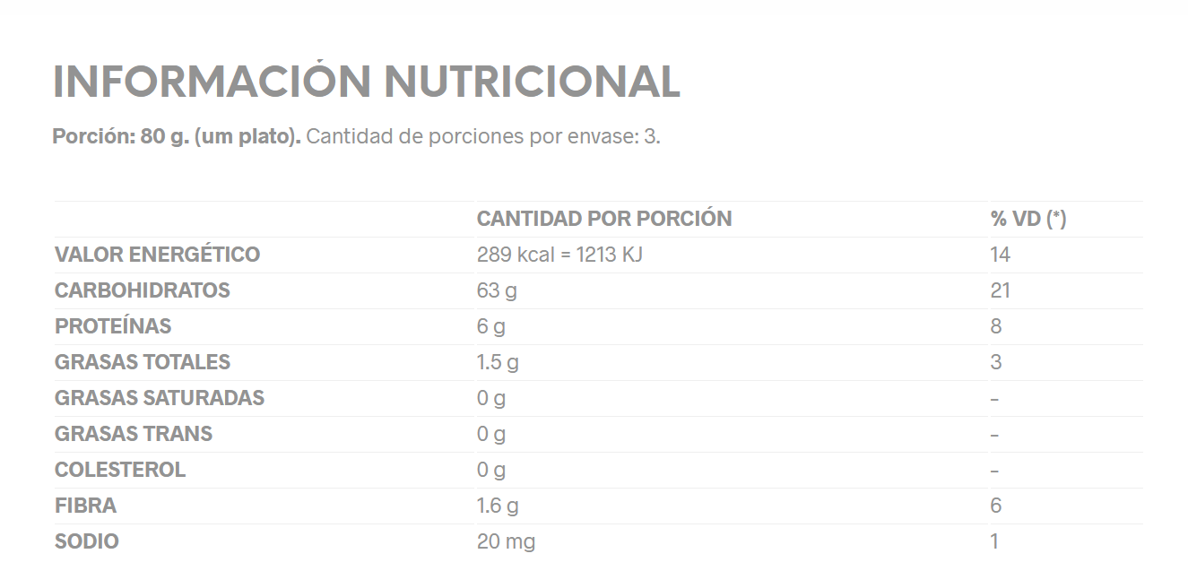 (*) Valores diarios con base a una dieta de 2000 kcal. o 8.400 KJ. Sus valores diarios puede ser mayores o menores dependiendo de sus necesidades energéticas.