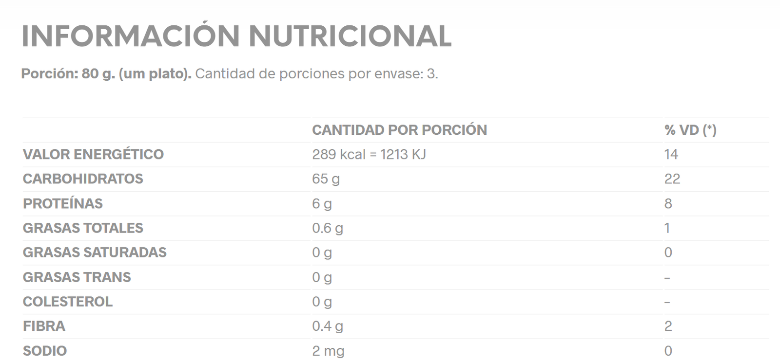 (*) Valores diarios con base a una dieta de 2000 kcal. o 8.400 KJ. Sus valores diarios puede ser mayores o menores dependiendo de sus necesidades energéticas.
